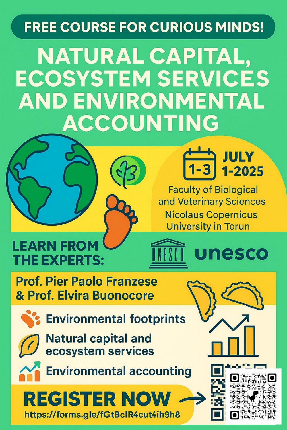 Serdecznie zapraszamy wszystkich studentów do udziału w intensywnym kursie pt. „Kapitał naturalny, usługi ekosystemowe i rachunkowość środowiskowa”, który odbędzie się stacjonarnie w dniach 1–3 lipca 2025 roku na Wydziale Nauk Biologicznych i Weterynaryjnych Uniwersytetu Mikołaja Kopernika w Toruniu.