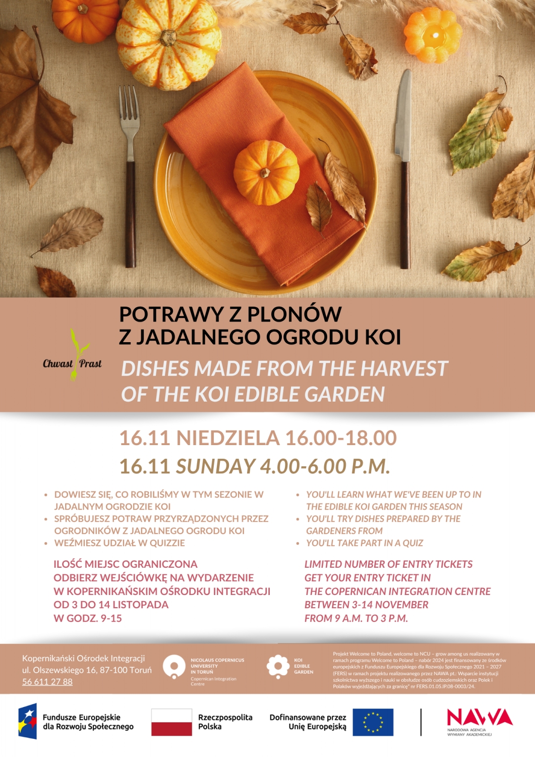Kopernikański Ośrodek Integracji wraz z Jadalnym Ogrodem KOI zapraszają na jesienną degustację dyniowych potraw.