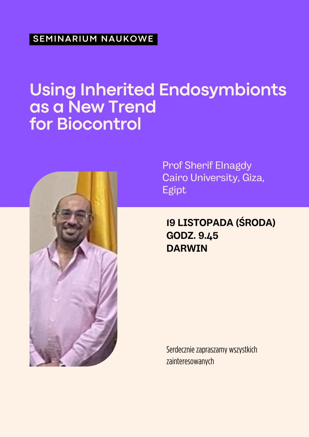 Prof Sherif Elnagdy z Cairo University, Giza, Egipt: "Using Inherited Endosymbionts as a New Trend for Biocontrol"