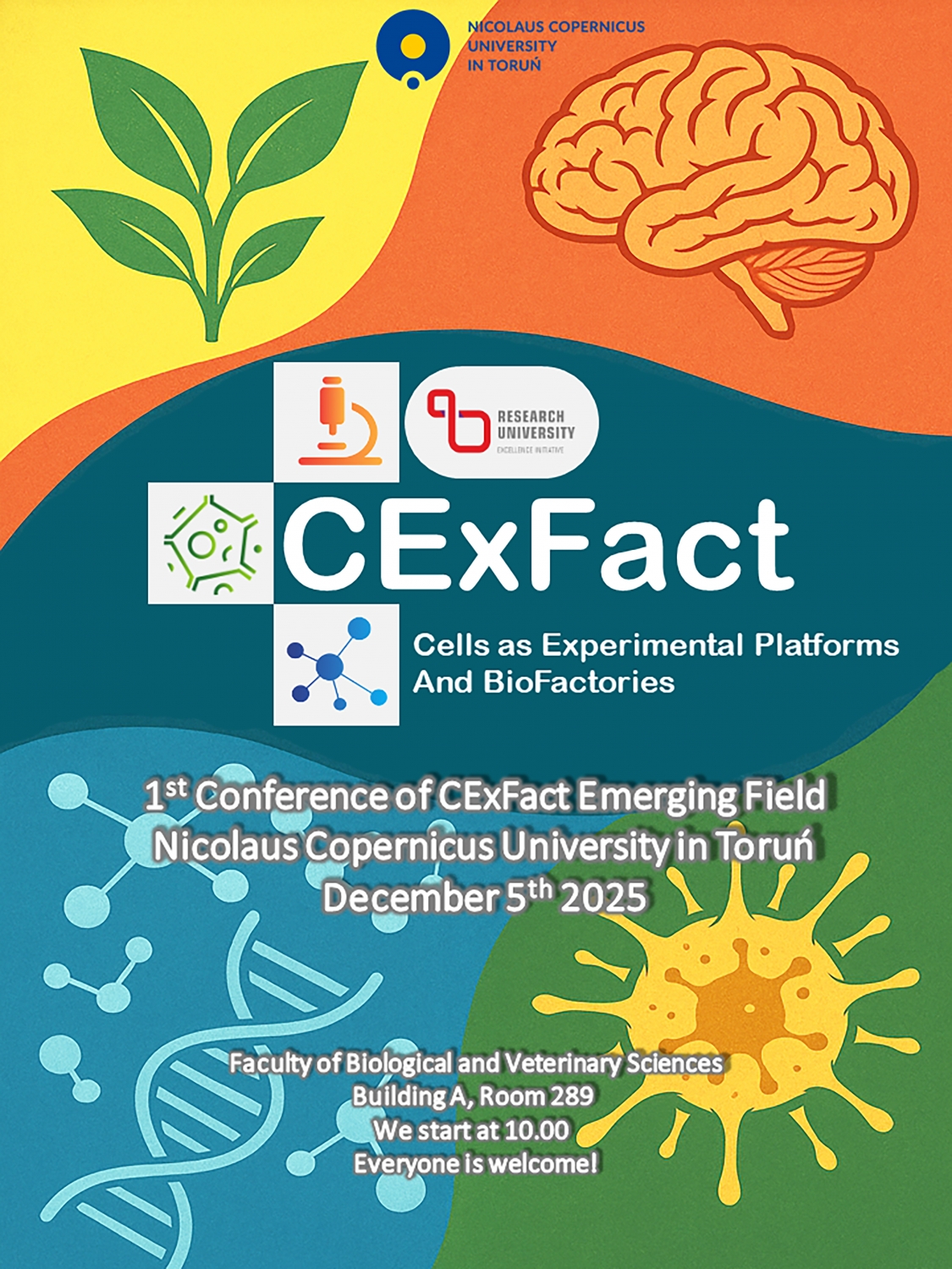 Już 5 grudnia 2025 roku na naszym Wydziale odbędzie się pierwsza konferencja naukowa CExFact – Cells as Experimental Platforms and BioFactories. Wydarzenie organizowane jest przez członków wyłaniającego się pola badawczego (Emergin Field) CExFact i poświęcone nowoczesnym kierunkom badań młodych naukowców nad komórkami jako platformami eksperymentalnymi oraz biofabrykami.