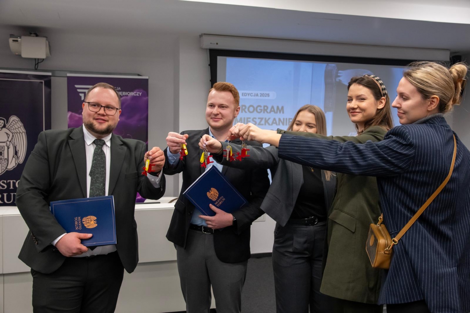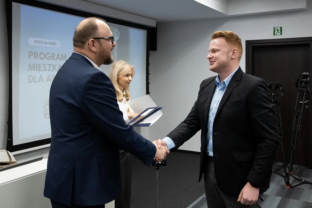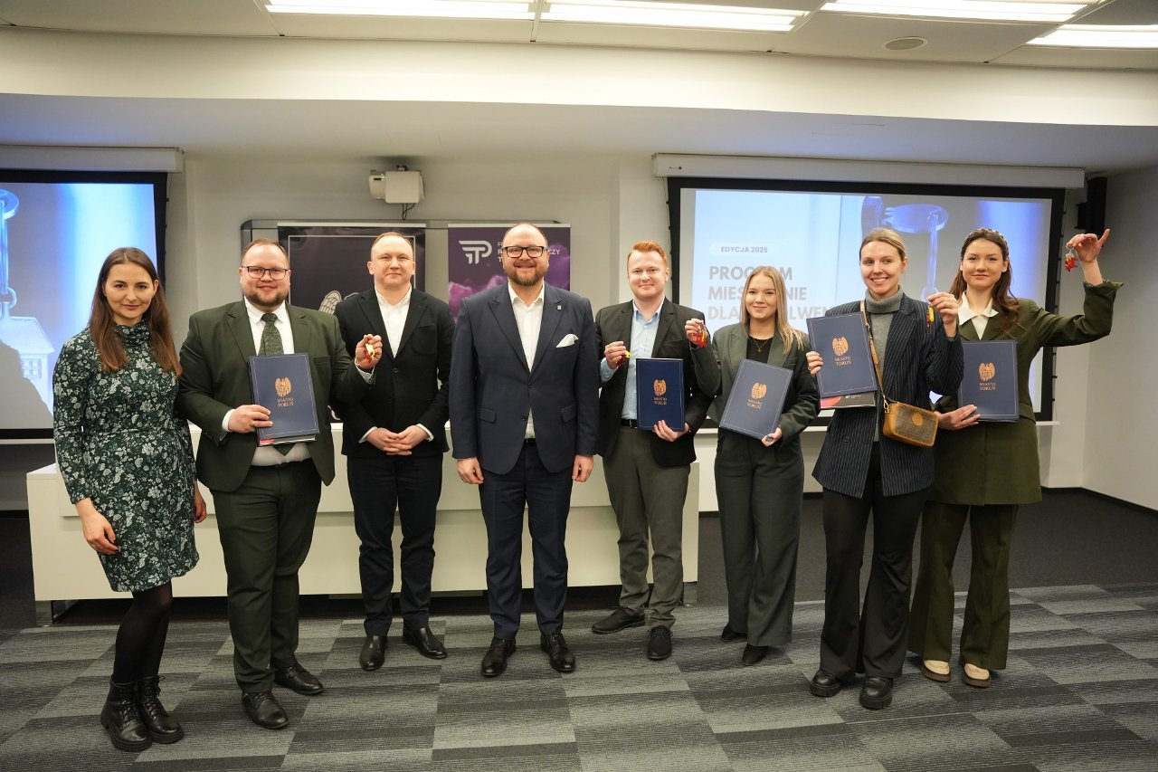 W dniu 12 stycznia 2026 r. podczas spotkania z Prezydentem Miasta Torunia, Panem Pawłem Gulewskim, oraz przedstawicielami Zakładu Gospodarki Mieszkaniowej, odbyło się uroczyste wręczenie kluczy do mieszkań beneficjentom XI edycji programu „Mieszkanie dla Absolwenta”. Miło nam poinformować, że w gronie wyróżnionych znalazł się Pan Daniel Szarmach, pracownik i doktorant naszego Wydziału. Serdecznie gratulujemy!